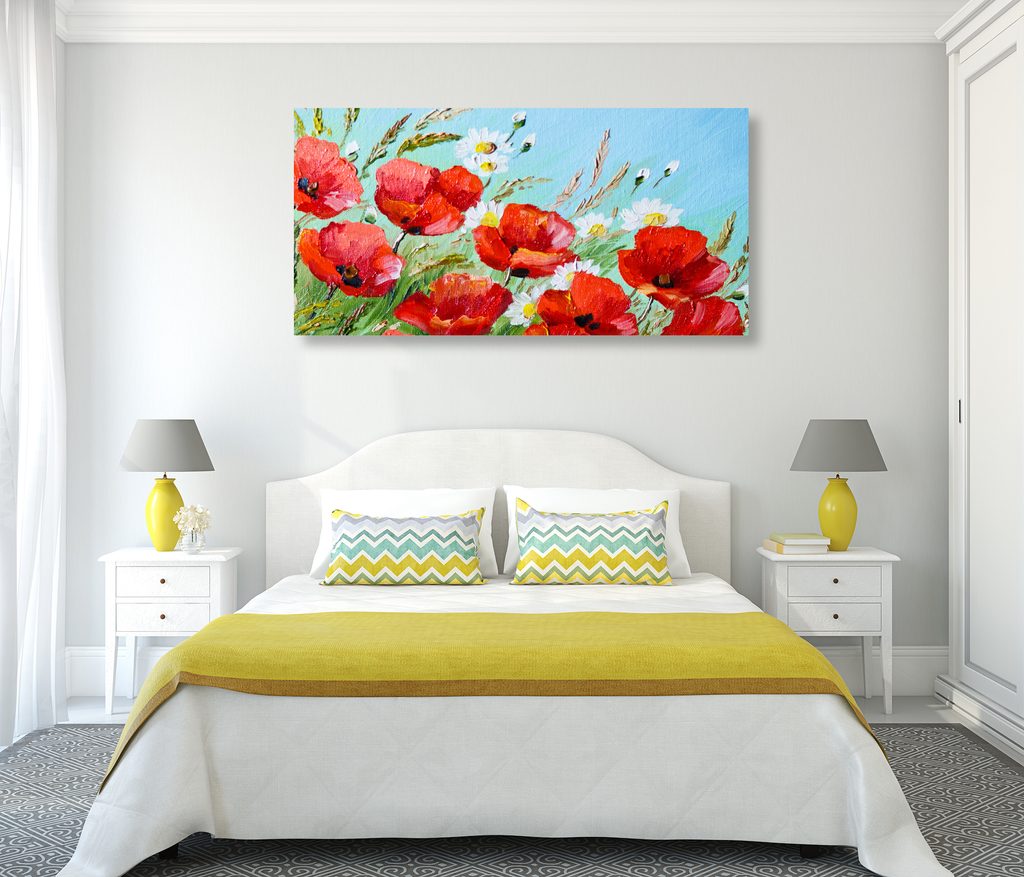 Canvas schilderij van rode klaprozen in een veld vangt de schoonheid van de natuur met helderrode bloemen in contrast met de blauwe lucht. Details zoals witte bloempjes en groene stelen geven de compositie frisheid en levendigheid. Warme kleuren creëren een vrolijke en optimistische sfeer die elke interieur opvrolijkt. Dit schilderij is de ideale keuze voor natuurliefhebbers en bloemenfanaten die een vleugje elegantie aan hun huis willen toevoegen. Het schilderij is van hoge kwaliteit, wat zorgt voor een lange levensduur en kleurvastheid.