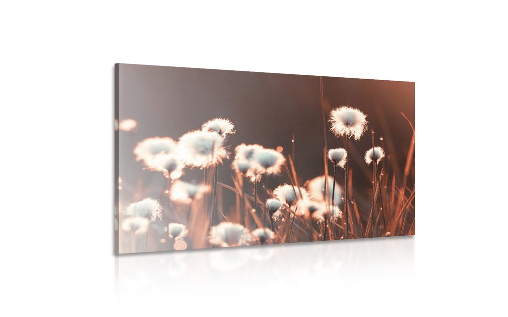 Canvas schilderij van katoengras vangt delicate bloemen met luchtige witte koppen die zachtjes op de achtergrond zweven. Details zoals fijne stelen en kleine dauwdruppels geven de compositie diepte en natuurlijkheid. Warme tinten bruin en beige creëren een rustige en aangename sfeer, ideaal voor het gezellig maken van elk interieur. Dit schilderij is een uitstekende keuze voor natuurliefhebbers die een beetje rust in hun ruimte willen brengen. Gemaakt van hoogwaardige materialen, garandeert het een lange levensduur en kleurvastheid.
