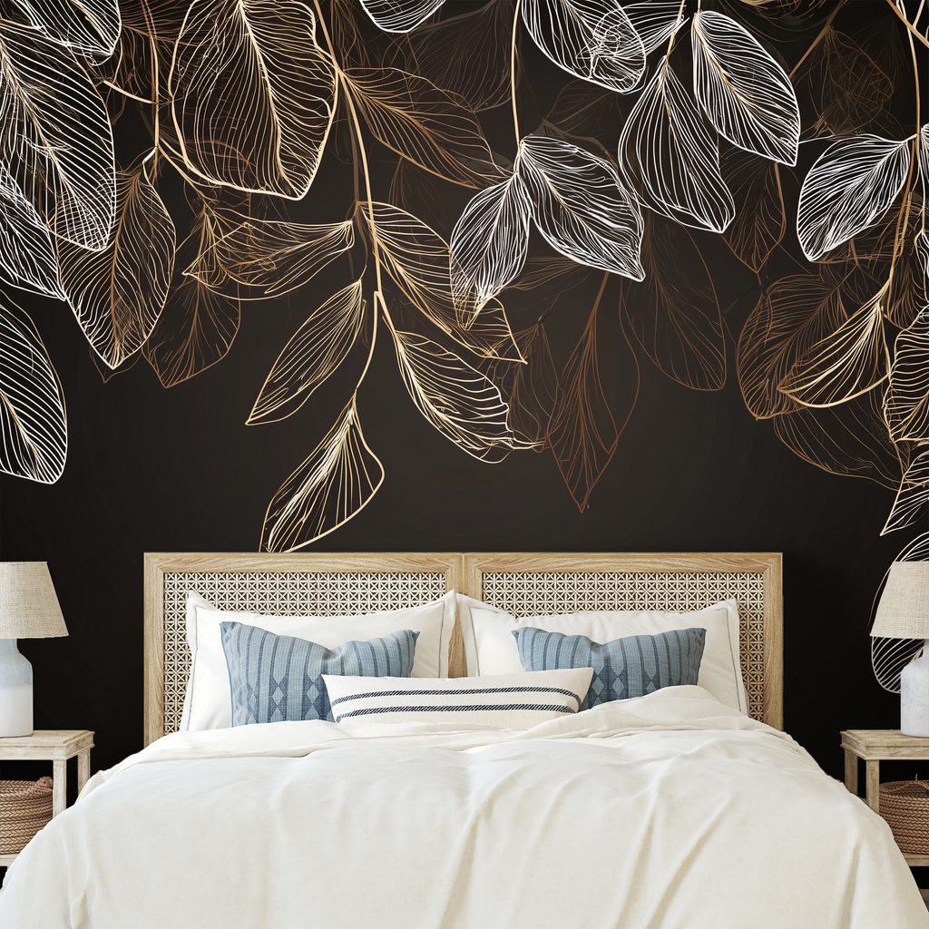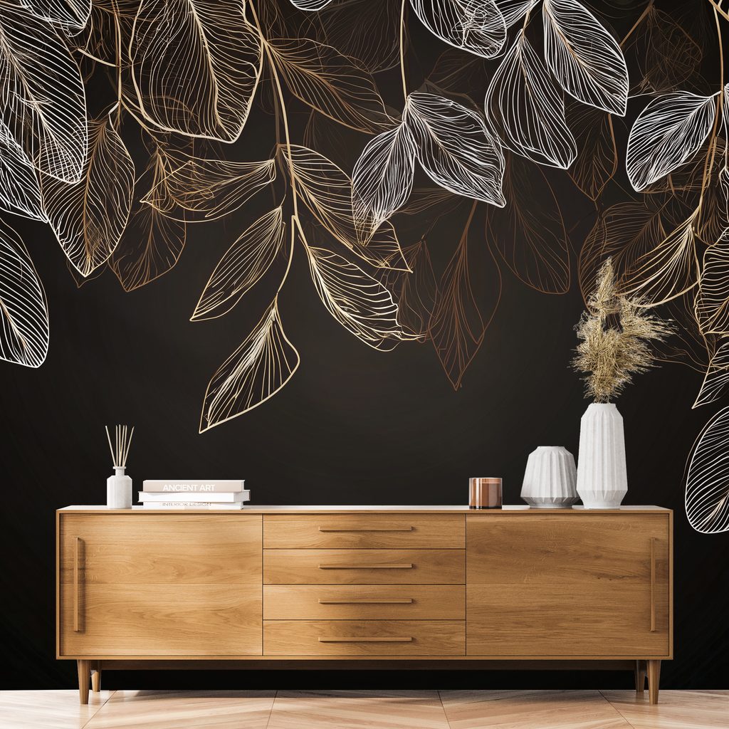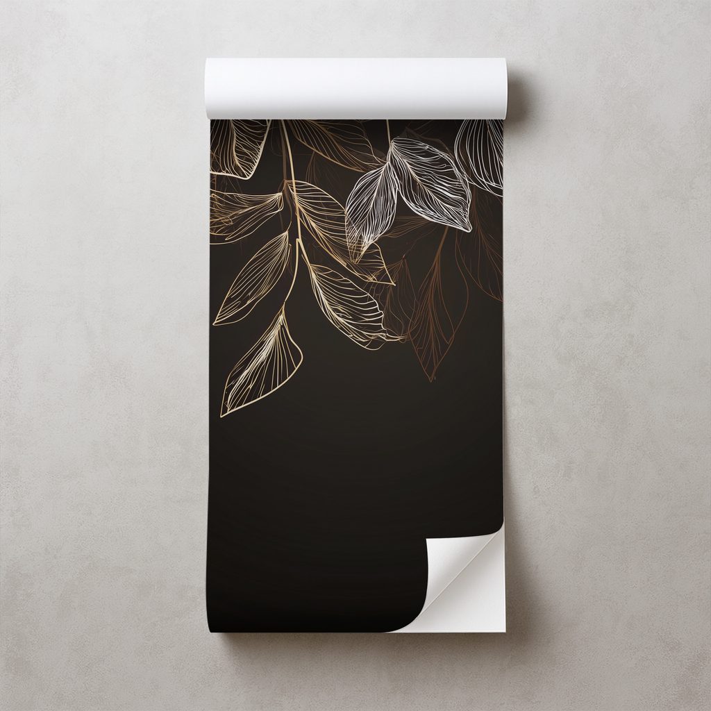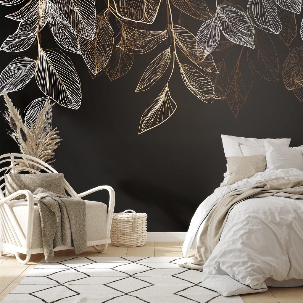 Zelfklevend fotobehang elegante gouden bladeren op donkere achtergrond