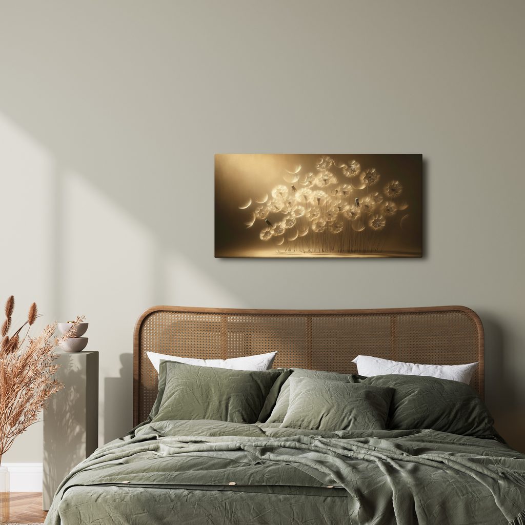 Canvas schilderij met zwevende paardenbloempluis brengt een gevoel van lichtheid en elegantie in uw interieur. De fijne details van het pluis en hun beweging creëren een gevoel van vrijheid en luchtigheid. Warme goudtinten geven het schilderij een gezellige sfeer waar u van zult houden. Ideaal voor de woonkamer of slaapkamer, dit schilderij zal elke ruimte tot leven brengen. De hoge printkwaliteit garandeert een lange levensduur en levendige kleuren.